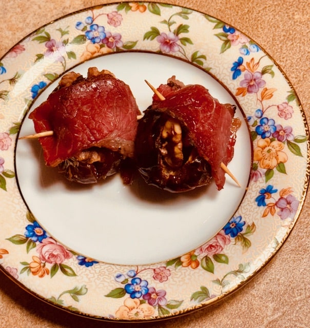 Pop the tray into the oven and bake for 20 minutes. The pastrami gets a bit crispy, the dates get a bit “melty” and the scent will drive you nuts. If you use the large dates as I do, two dates is a perfect starter.