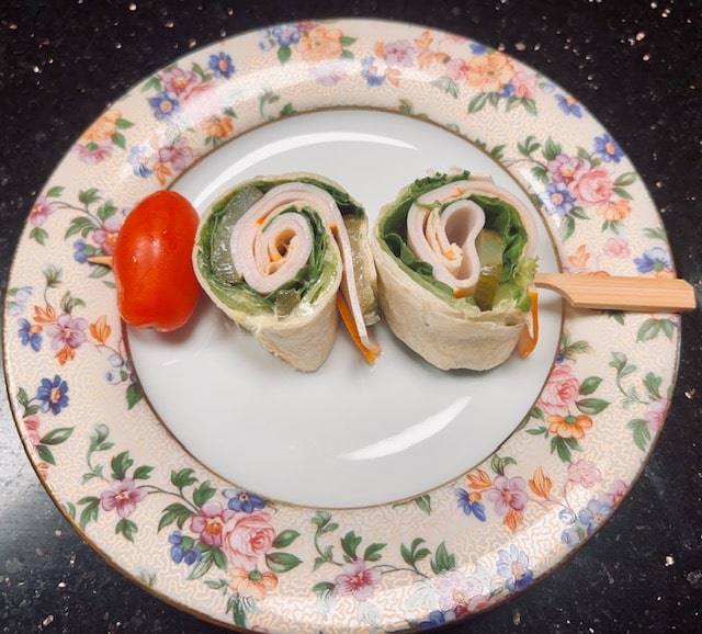 Place a tortilla on a cutting board and put a teaspoon or two of mayo on and top with 1/2 teaspoon mustard. Swirl together and coat top of tortilla with it. Next put a layer of spinach leaves or sturdy lettuce leaves. Scatter some sliced pickles on top. Take 4 slices of turkey and place overlapping on the pickles. Roll the tortilla tightly around the filling ending with the seam face down. If eating later on (even overnight works) wrap tightly with foil or plastic wrap whole and refrigerate till shortly before serving. If eating soon, using a sharp knife, cut the wrap into 5 even slices. Take a wooden skewer (I like to use short ones) and press into the roll from the side so you see the pinwheel effect and put 2-3 pinwheels on skewer and top with a cherry tomato. Can be eaten as a first course if you use one skewer or as a main if you use a few. Nice with a scoop of potato salad.