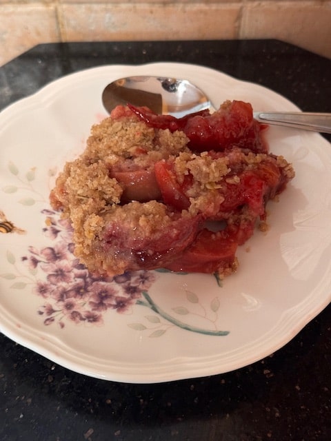Pop the crumble into the oven and bake 45-50 minutes or till golden brown on top and fruit is bubbling and slightly oozing out from cracks.