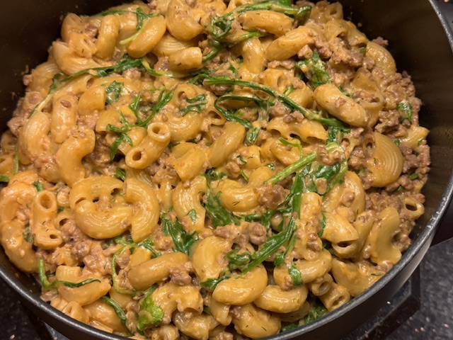 After all the fancy cooking we’ve done for the holidays, you still (GAH!) have to cook and feed the troops. I know, cuz it happens to me and yeah although I’m a foodie, there are days when you want something simple and relatively uncomplicated but still tasty. This fits the bill, a one pot dinner that is definitely comfort food at its finest. Also, while it’s best served hot when done, it’ll lurk nicely for a day or two in the fridge, might just need a bit more tomato sauce tossed in when reheated. It’s especially nice now with the cold/rainy weather we are having. Creamy, hot, meaty and with pasta, what could be bad?