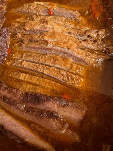 Cover tightly with 2 layers of foil on top of pan. Place brisket in oven and bake for about 3 hours. Remove from oven and check how soft meat is. If not fully tender continue cooking covered with the foil for about 30 minutes to 1 more hour or until completely tender. Allow meat to rest about 30 minutes before slicing. This freezes beautifully, so I usually rest, slice, and freeze with gravy and wrap well till I need it.