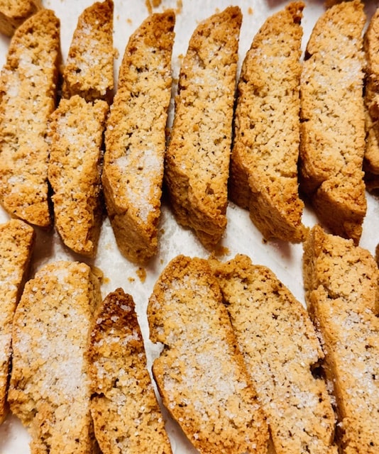 Place the slices back in the oven and toast for at least ten minutes and even fifteen if you like them crispier. Let cool completely before storing in tins. Fabulous with tea or coffee.