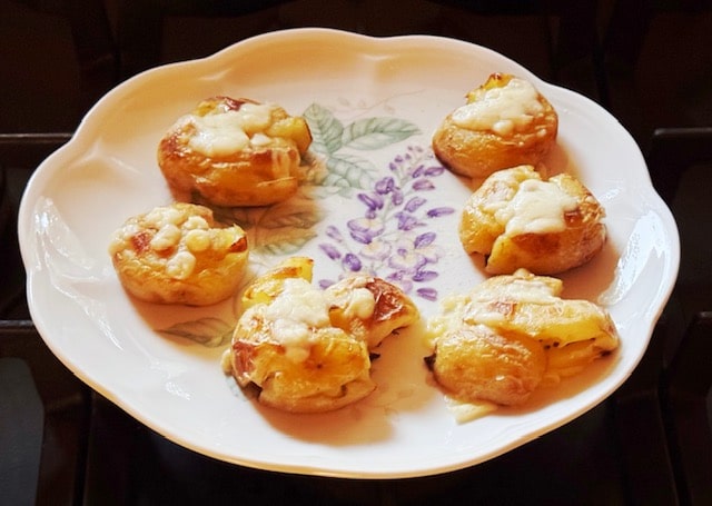This is a tough one, since I really love me these smashed potatoes with or without cheese. The cheese topped has a crispy crustiness going on with the ooey gooey cheese texture to make your mouth sing. If you go with the regular smashed potato version, you get all over crispiness. So both are a win – it depends on my mood and also if I am serving dairy or not. If you want to make this quickly, I suggest that you use microwaveable potatoes because you speed it up this way. So gather your ingredients and let’s go!