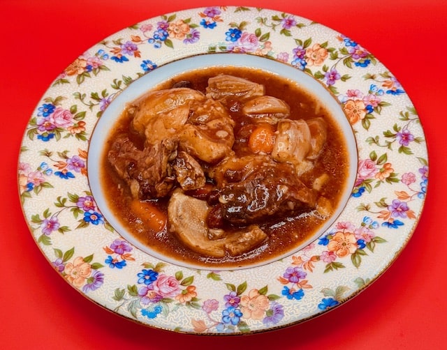 and cook about 5 hours. Poke the meat with a wooden skewer to see if it’s soft enough, if still not, continue cooking about another half an hour. About 15-20 minutes before serving, take 2 rounded tablespoons of cornstarch, dissolve in 1/3 cup of cold water and stir well till the cornstarch dissolves. Remove lid from cooker, and stir cornstarch mix into stew. Recover the cooker and cook just till slightly thickened. Wonderful served as is or with rice or mashed potatoes.