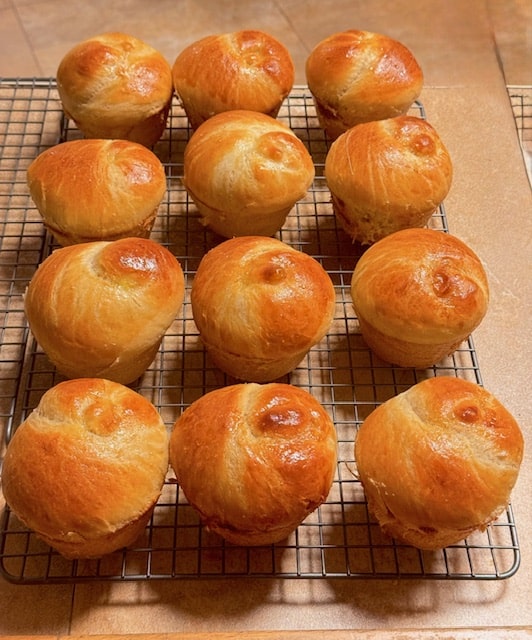 When dough has risen, turn dough out onto an oiled mat and oil your hands. For the large rolls that I made, I divided the dough into 12 more or less equal pieces. Let rest a bit and then form into balls by smoothing and tucking them. Then roll each piece into a snake and make knots. Brush tops of rolls with the beaten egg and place into spray oiled large muffin cups to rise again, approximately 30 minutes or so. I find an unheated oven with just the light on is a great spot to let them rise.