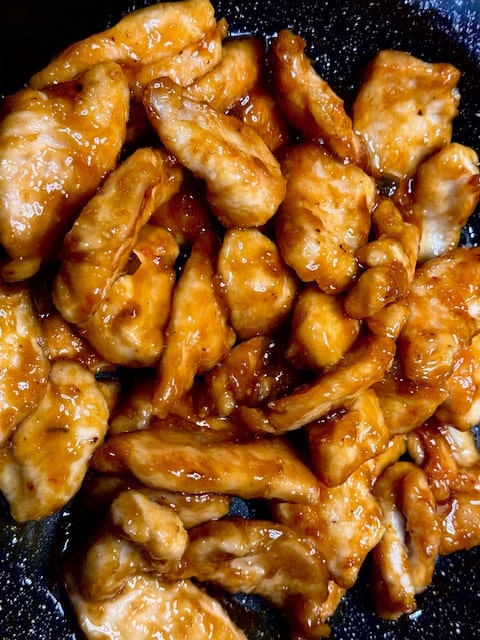 Now to the sauce and if you don’t have any burnt or nasty bits in the pan (you shouldn’t if you fry on medium) you can use the same pan for the sauce. K. Briefly, I mean literally for a few secs, warm in the oil in pan (add more if it’s all gone) the garlic and ginger and add all the other goodies together, the honey, sweet chili sauce, orange peel, scallions, rice vinegar, salt, sesame oil, soy sauce and regular oil.