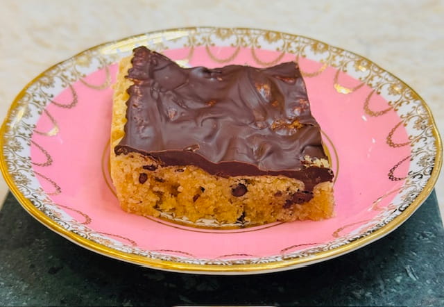 No, this is not a typo! You are using chocolate chips in two different ways in this recipe. And I’ve got a secret shhh 🤐 🤫. It’s reasonable to wonder how I get taste testers for new Passover recipes. People tend to look at you a little horrified (not on Passover proper when they look endlessly for goodies but beforehand) when you offer a Pesach goodie and say, it’s really good! It tastes like during the year when you’re baking with flour. Jewish comics have a good time with this too. In any event, I did what any reasonable cook/baker in my shoes would do, I simply didn’t mention it and served it as dessert to a whole bunch of people for two separate Shabbat meals. After all, I firmly believe that if you know it’s KLP you will be prejudiced against it. It was a really good idea on my part cuz what the general consensus was, it’s so delicious! really rich and good. Hmmm maybe I’ll have just a bit more. Warning, it is very rich. I served it in thinner bars than pictured and then people went back for more so that speaks for itself. It’s really easy to put together and a nice recipe you can serve any time. Also, yup yup, you can successfully freeze it but I recommend cutting into bars and then freezing.